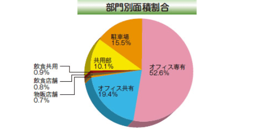 たとえば、延床面積が35,000㎡程度のビルを例にすると、専有オフィス部分だけでなく、エレベーターホールやトイレなどのオフィス共有部、受変電設備や機械室といった共用部でも多くのエネルギーが使用されています。特に「レンタブル比(一般オフィス面積/延床面積)」が省エネ管理の指標となり、この比率が低いほど共用部分のエネルギー比率が相対的に高まる傾向があります。