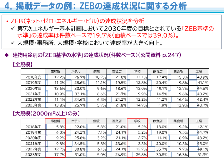 特に注目すべきは、「ZEB基準(建物の一次エネルギー消費量を国の基準から30〜40%削減することを目指す水準)」の達成率が件数ベースで19.7%、床面積ベースで39.0%に達した点です。前年度(2022年度)と比べると着実に向上しており、なかでも延床2,000㎡以上の大規模事務所では12.7%→17.7%へと大きく伸びています。