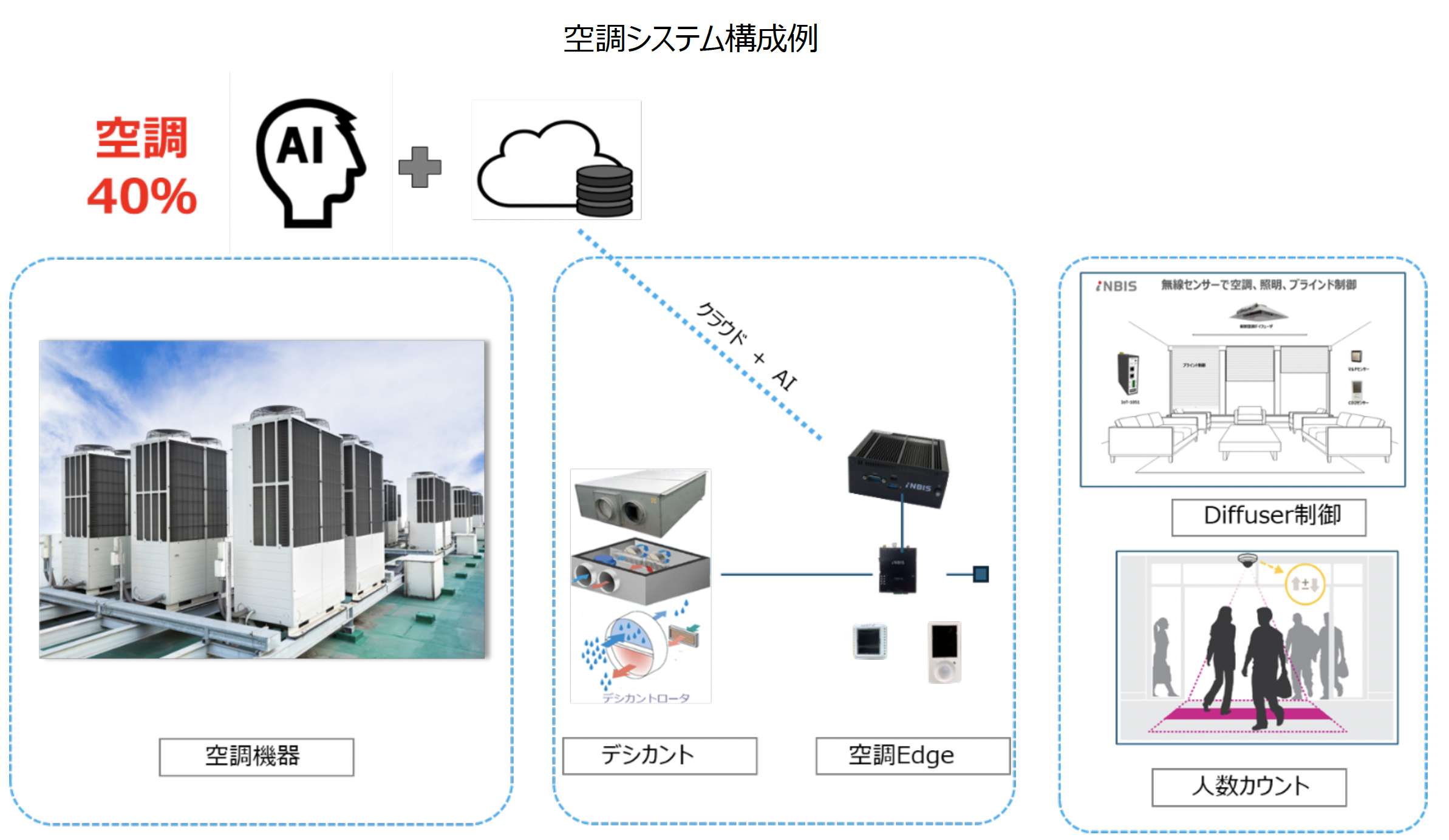 オフィスのエネルギー使用量の約40%を占めるのが空調と言われます。空調機の温度制御を行うだけではなく、デシカント技術(除湿)と組み合わせたり、人数カウント、ブラインド制御、ディフューザーを制御したりして、快適な空間を作りだすことができます。